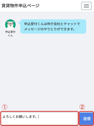 メッセージ画面が表示されますので、①メッセージを入力し、②「送信」をタップします。