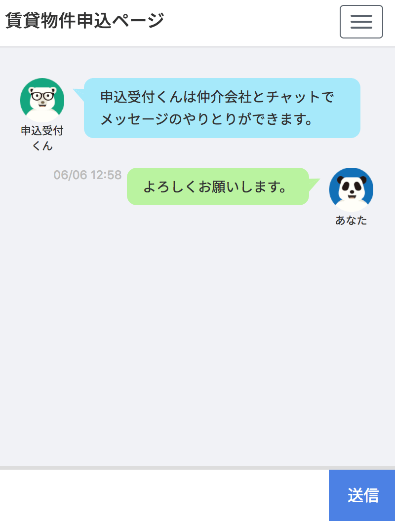 申込一覧の詳細下の「仲介会社とのメッセージ」ボタンをタップしてください。